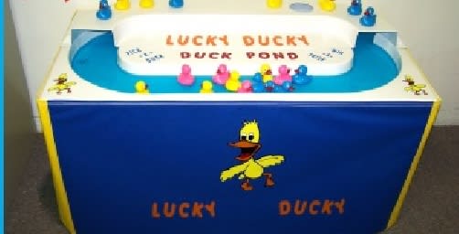 Vår andedam står på et spesialtilpasset bord med et kar der en flokk med glade plastender flyter rundt.
