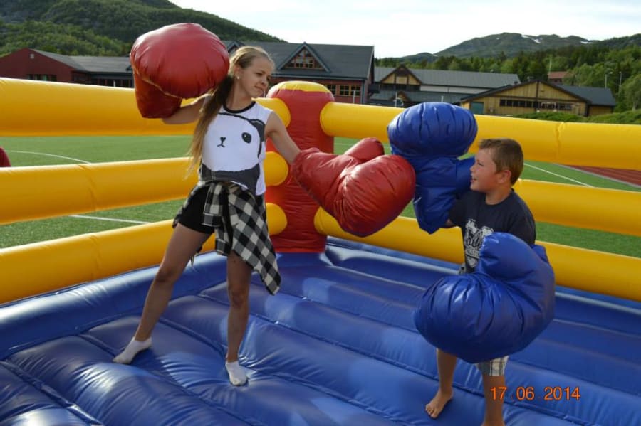 Er du klar for å ta på deg store boksehansker og stige opp i vår oppblåsbare boksering? I vår boksering så kan du og dine venner eller kollegaer ta på dere store, oppblåsbare hansker og gi hverandre en real boksekamp!