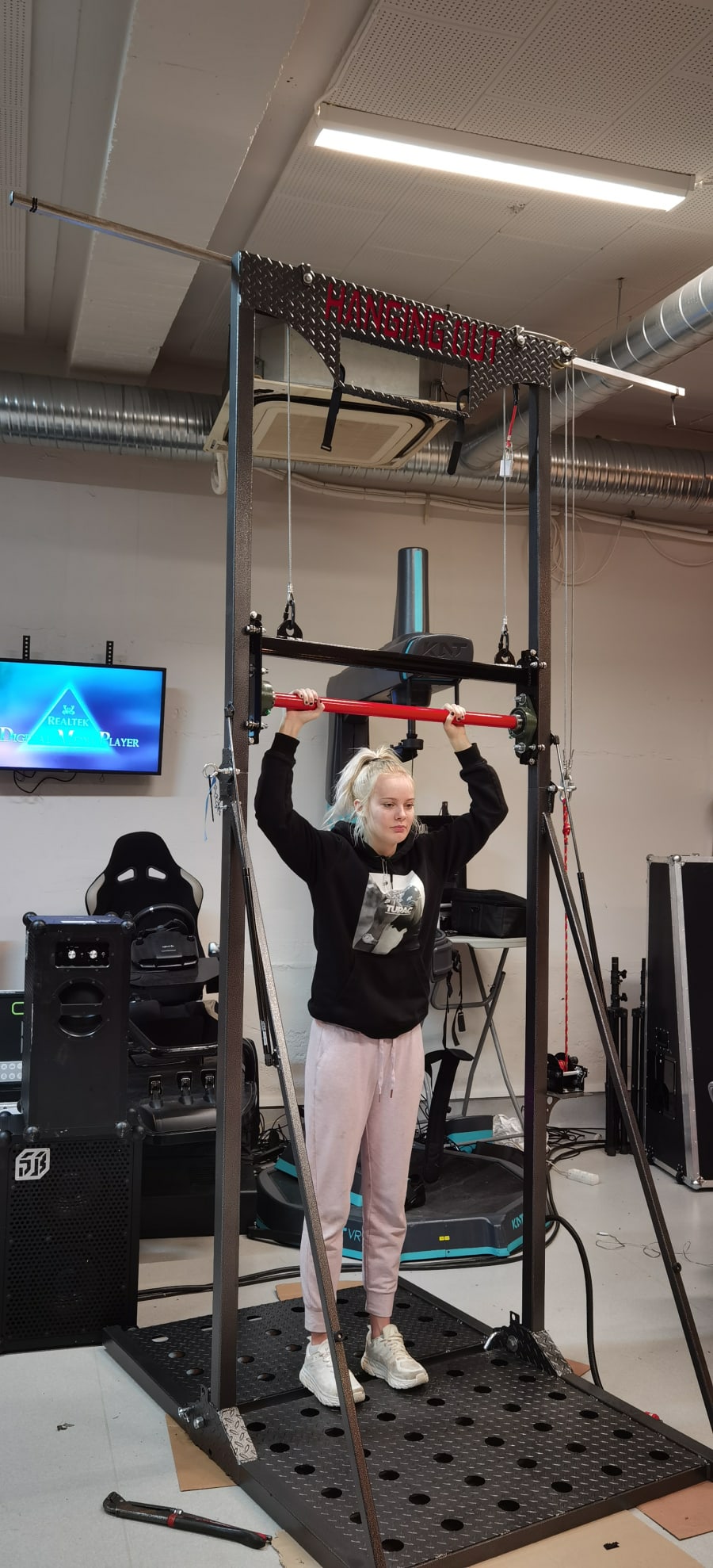 Her blir deltakeren heist forsiktig opp mens de henger i en stang. Deltakeren Skal henge så lenge som mulig uten å falle ned. Enkelt ? :)