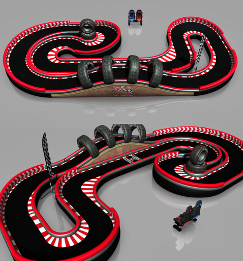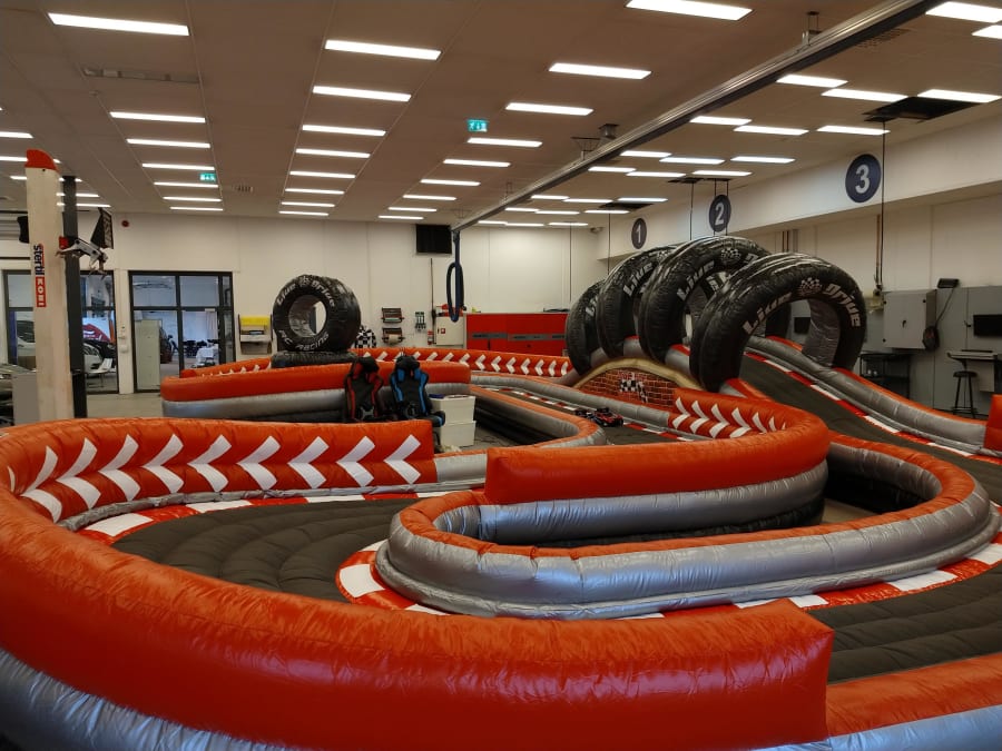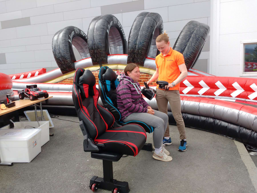 Fantastisk tøff bilbane. To stykk fjernstyrte biler med påmontert kamera styres med fjernkontroll av gjestene som ser bilde i videobriller.