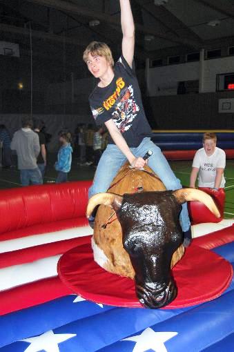 . Mekanisk rodeookse med oppblåsbar madrass. Oksen er svært trygg med myke horn og mykt hode . Oksen kan kjøres i faste programmer for lik utfordring til alle ryttere, eller den kan styres manuelt for å tilpasses den som skal ri. Oksen leveres kun inkl. operatør. pris hjemmeside er inkl operatør 1 time. Tillegg for tid utover dette.